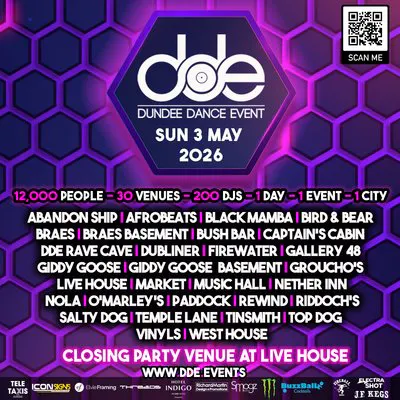 The first Dundee Dance Event took place on Sunday 30 August 1998, with 17 DJs playing in 9 city centre venues. The event has now grown to 200 DJs and artists playing in 30 venues, including a daytime underground car park venue and closing party with a 3200 capacity.