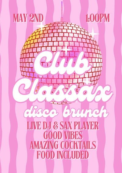 Join us for a fantastic afternoon at our club classax disco brunch. Live DJ and sax player, it's an amazing day out.