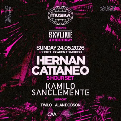 Musika presents Skyline's 4th Birthday on Sunday 24th May 2026, landing perfectly on the Bank Holiday weekend and shaping up to be one of the biggest nights Edinburgh has seen in years. To mark the occasion, we're bringing back a true legend. Hernan Cattaneo returns for his 7th Skyline appearance, delivering an extended 5‑hour set - and making his first Edinburgh performance in over two decades. A proper moment.