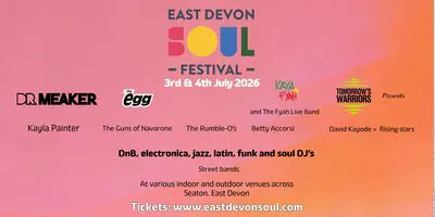 East Devon Soul Festival is situated at a range of venues across the town of Seaton, a beautiful seaside location on the South coast of England. The music crosses borders from jazz to electronica, funk to drum and bass, music that connects and has soul. Acts include the wonderful Dr Meaker, festival legends The Egg, upcoming drum and bass artist Kaya Fyah and The Fyah Live Band, ska merchants The Guns of Navarone to electronic artist Kayla Painter. World renowned jazz talent agency Tomorrow's Warriors, home of Ezra Collective and Nubya Garcia, will be presenting three of their top new artists including David Kayode. DJ's will be performing in venues overlooking the beach playing a mix of electronic dance genres across house, drum and bass, hip hop etc... whilst street bands and local musicians will be playing across the town during the day. Seaton will resonate to the sound of music.