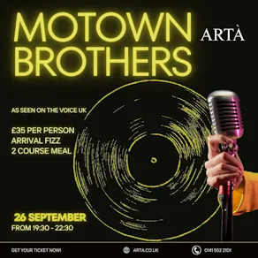 This ticket guarantees 1 person entry to our Motown Brother's Event with a glass of fizz on arrival and a 2 course set dinner. Guests should arrive at 7.15pm for a prompt 7.30pm start. Club entry is from 11pm. Purchase is valid for advertised date only. Over 18s only. ID may be required. Please advise of any dietary requirements ahead of the event and if you a joining anyone else who has purchased tickets and we will endeavour to seat you together. Guests may be seated with other parties. Multiple purchases welcome. Unfortunately, the room is not wheelchair accessible.