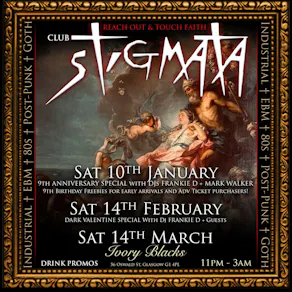 Club Stigmata brings you the freshest new and old classic Goth, EBM, Post-Punk, Industrial and Darkwave music in Glasgow’s friendliest club, the Dj’s will always play requests where possible! There are also always cheap drink promos incl Premium Bottled Beer, Vodka + splash & Tequila + slash all at £3.50