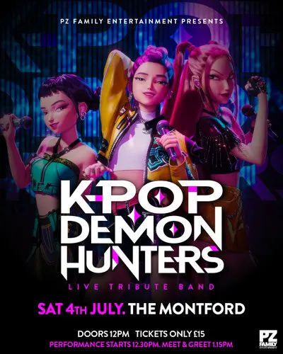 Experience a high-energy live performance from the K-Pop Demon Hunters Tribute Band, packed with fierce choreography and fan-favourite hits at The Montford on Saturday 4th July 🎤✨