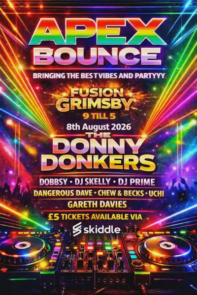 We have the Donny donkers headlining for us a long with Dobbsy dj skelly dj prime dangerous Dave uchi chew & becks and Gareth davies here at apex bounce we will bring you the best bounce tune out there with a fun friendly atmosphere get you tickets now