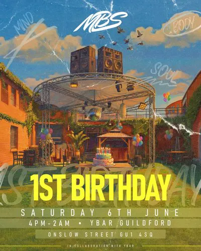 On the 6th of June MBS will be taking over Y bar in Guildford to celebrate their 1st birthday with their first day-to-night event of the year 4pm-2am🥳