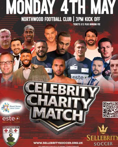 Celebrity charity football match at Northwood Football Club celebrating 100 years of the club while raising funds for Mount Vernon Cancer Centre Charity on Monday 4th May 2026