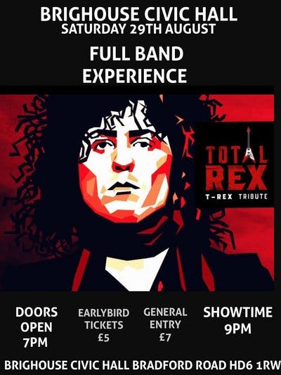 Get ready to Get It On! Total-REX T-REX Tribute is a sensational show fully endorsed by The Official Marc Bolan Fan Club ( OMBFC) - bringing the sounds of Marc Bolan and T Rex to life! A must see for all Bolan, Glam Rock and 70s Music fans alike, the show features all the T Rex big hits from 1970s along with firm album track favourites - and much much more! Formed in 2021, this powerhouse band have quickly established themselves as one of the UKs favourite and leading T Rex Tributes. Whether you're a die-hard fan or just love the Golden Era of Glam, this show will transport you straight back to the Glitter- drenched magic of the 70’s. The band are also lifelong T Rex fans too and know their stuff!!