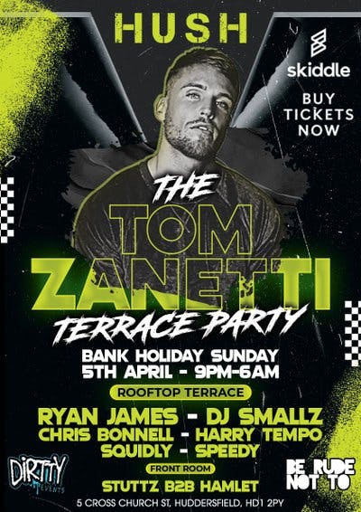 This Bank Holiday Sunday, Huddersfield’s nightlife goes next level as Tom Zanetti takes over the rooftop terrace at HUSH for a special 9PM – 6AM shutdown.