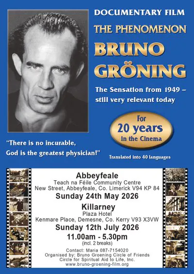 The film, “The Phenomenon Bruno Groening - In the footsteps of the miracle healer”, shows the events surrounding Bruno Groening. In autumn of 1949, close to 30,000 people were drawn to the Traberhof in Rosenheim daily. Newspapers, radio and television reported: “It is beyond reason. Bruno Groening heals the crippled, the blind, the deaf...”