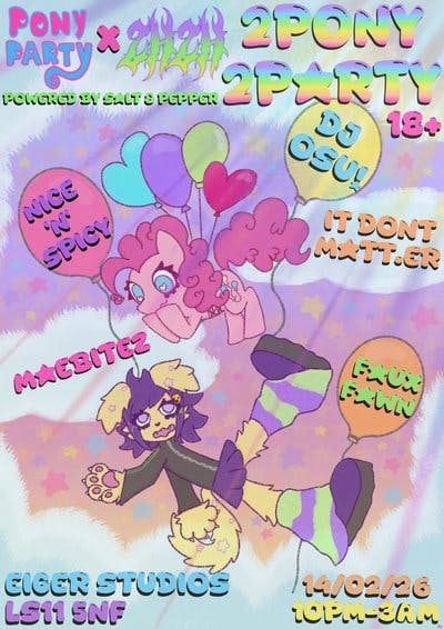 Kicking off at 10PM on 14/02/26 at Eiger Studios, we invite furries, ponies and dudes who just like good music to come party with us! It's Valentine's Day and love, friendship and PLUR is in the air! 💜🌈 Bring your partner, your friends or come solo to dance with and meet likeminded cool cats! 😽