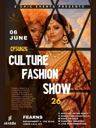 2Chic Events presents CFSUK26: Culture In Motion - a bold, modern runway experience celebrating culture, fashion and creative expression at Leeds Dock. This year's show brings together standout designers, powerful performances and a vibrant atmosphere that champions identity, movement and community. Expect an immersive night where culture comes alive on the runway.