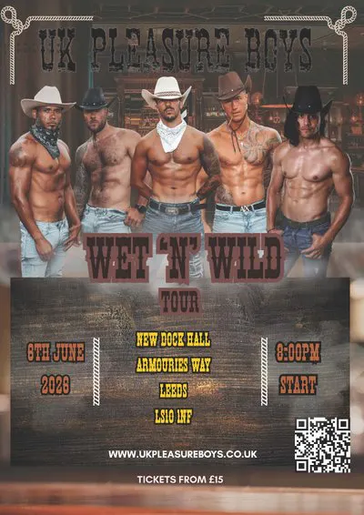 Get ready to ride into the wildest night of your life with the UK Pleasure Boys' Wet & Wild Western Style Strip Show - where cowboy boots meet bare chests and the saloon doors swing open to pure, unfiltered entertainment!