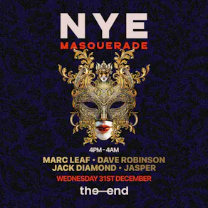 Join us at The End on New Year's Eve (Wednesday 31st December) for our Masquerade party with DJ's Marc Leaf, Jack Diamond, Dave Robinson and Jasper from 4pm until 4am. Don your favourite mask, gather your friends and bring in 2026 in true style with the ultimate party atmosphere counting down to midnight and beyond.