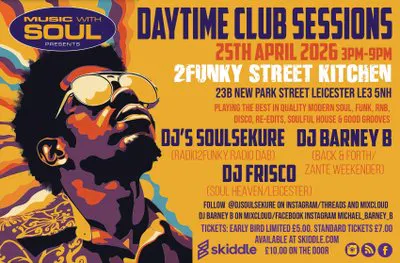 Music with Soul promotions presents a day time clubbing event to be held in the Luxurious 2 Funky Complex, in the street kitchen area, with outside area in the heart of Leicester and features Midlands finest Dj's SOULSeKURE (Radio 2 Funky) Dj Barney B (Back & Forth) Dj Frisco (Soul Heaven) playing the best in Quality Modern Soul, Funk, Rnb, Disco re-edits and Soulful House and good grooves