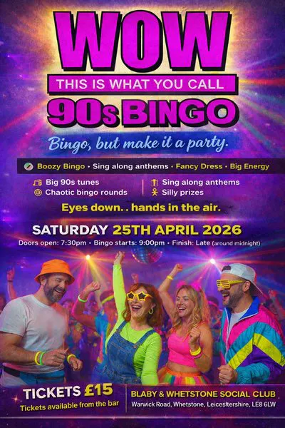 We're bringing a full-on 90s Boozy Bingo party to Blaby & Whetstone Social Club - and it's shaping up to be a BIG Saturday night out.