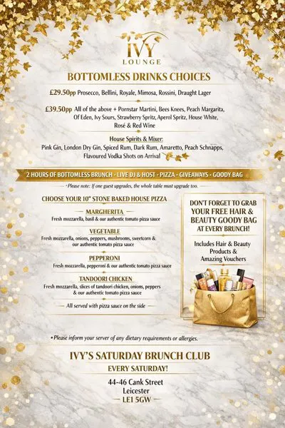 £39.50pp All of the above + Pornstar Martini, BeesKnees, Peach Margarita, Of Eden, Ivy Sours, Strawberry Spritz, Aperol Spritz, House White, Rose & Red Wine