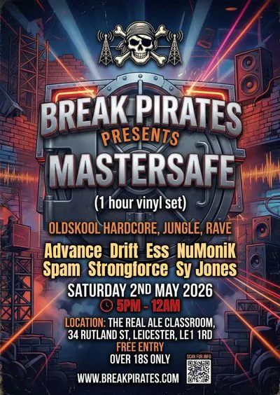 Break Pirates return to Leicester after 16 years with a special night of all things Oldskool. We'll be welcoming special guest and local legend Mastersafe (Total Kaos, Dreamscape, Fantazia) who will be playing an exclusive underground vinyl set.