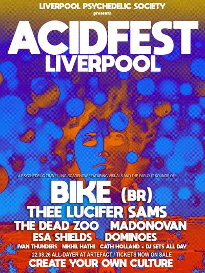 ACIDFEST LIVERPOOL brings acclaimed Brazilian psych-rockers Bike as headliners of this mini psych fest ALL-DAYER at Artefact on Roscoe St, featuring three bands, five solo acts, poetry and Coffee and Turntables DJs, offering you a diverse mix of farout sounds and enterteinmant for the whole day.