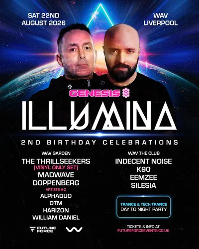 Genesis returns with ILLUMINA, celebrating two years of unity, energy, and unforgettable moments. For our 2nd birthday, we're going all‑in with a world‑class trance lineup: the legendary Thrillseekers, a master of pure, unfiltered tech-trance Indecent Noise, Swiss maestro Madwave, and the hard trance legend K90, plus a stacked roster of Genesis residents and rising talent. Expect a night of pure emotion, high‑voltage euphoria, and that signature Genesis atmosphere that brings everyone together under the lasers!
