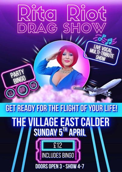 Get ready for a high-energy afternoon of drag, live vocals, laughter and chaos as the one and only Rita Riot touches down at The Village East Calder for an unforgettable Drag Bingo spectacular ✈️💄
