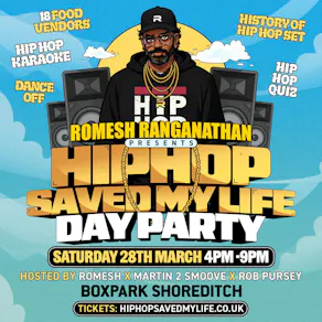 Yes, back once again we’re bringing you the ultimate HIP HOP DAY PARTY with Romesh & his friends. Beats, Booze & BOXPARK Vibes Expect legendary BOXPARK beers, mouthwatering street food for all (inc Vegetarian & Vegan options), and a handpicked lineup of Romesh’s favourite Hip Hop DJs dropping nothing but stone-cold Hip Hop classics. Think 90s jams, golden-era bangers, and tracks that defined the culture.