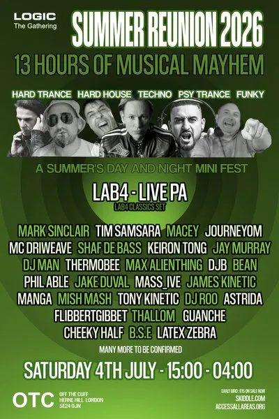 Summer reunion 2026 with 3 areas 10 hours of sound featuring over 38 DJs - Hard Trance, Hard House, Techno, Psy Trance and Funky beats