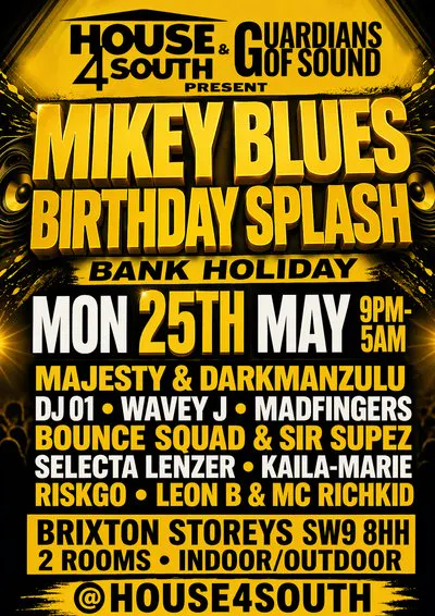 Get ready for an unforgettable Bank Holiday session as House 4 South and Guardians of Sound present Mikey Blues Birthday Splash — a high-energy celebration bringing together some of the hottest names in house, bass, and underground sounds 🔥