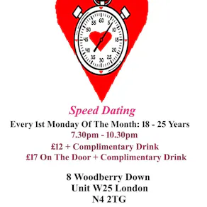 Speed Dating: It's time for love. The experience, of meeting someone new, to form a connection. Taking place at Creativity In Our Hands: Suzanne Asphall. 8 Woodberry Down, Unit 25, N4 2TG.
