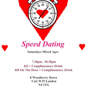 Speed Dating: It's time for love. The experience, of meeting someone new, to form a connection. Taking place at Creativity In Our Hands: Suzanne Asphall. 8 Woodberry Down, Unit 25, London N4 2TG.