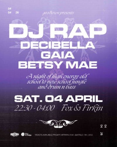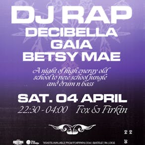 A night of high energy old school to new school jungle and drum n bass welcoming the legendary DJ Rap for her Fox debut - one of the undisputed queens of the DnB scene. She will be joined by some of the hottest emerging talent Decibella fresh from her debut record on AKO Beatz, plus Kool FM resident Gaia plus Sexy Lady Massive’s Betsy Mae