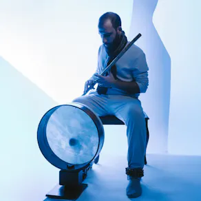 In a distinctive setup, he simultaneously performs the Nay alongside a leg-mounted frame drum and foot percussion. Faris fuses PalestinianTashbib—a percussive, improvisational Nay style—with the rhythmic footwork of PalestinianDabkedance. Having dancedDabkeprofessionally, he translates its patterns onto the leg-mounted frame drum, shapingJasadinto an embodied expression of Palestinian breath and culture.