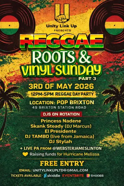 REGGAE ROOTS & VINYL SUNDAY PART 3 A proper Reggae Day Party brought to you by Unity Link Up Pure vibes and dubplate pressure