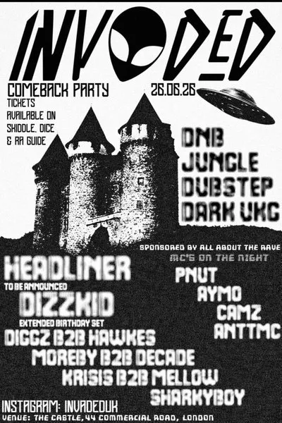 THE INVADED COMEBACK PARTY IS HAPPENING. EXPECT TO HEAR THE FINEST BASS MUSIC FROM OUR TOP DJ'S WE HAVE CAREFULLY SELECTED. THIS ONE IS GONNA TAKE YOUR BRAIN TO DIFFERENT DIMENSIONS. WE WILL BE INVADING THE CASTLE, WHITECHAPEL VERY SOON!!