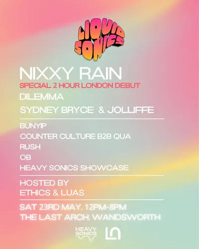 ![Liquid Sonics: Nixxy Rain [2 hours], Sydney Bryce, Dilemma](https://skiddle.imgix.net/9/5/b/2243064_bb4c7b20_liquid-sonics-presents-nixxy-rain-2-hour-set-_1024.jpg?auto=format%2Ccompress&width=auto&height=292)
