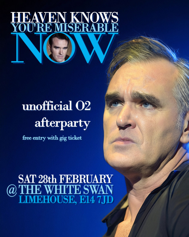 Join us at The White Swan, Limehouse (about 20 minutes on the DLR from The O2) for Heaven Knows You're Miserable Now's unofficial Morrissey O2 afterparty!
