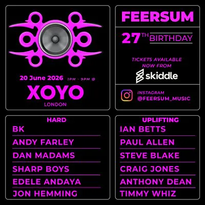 After the success of our winter knees up, we are back with a bang with our 27th birthday celebration at the newly furbished XOYO. We bring you a star studded DJ line up across two rooms with the king of hard house BK headlining the harder room along with Andy Farley. He is joined by our fabulous resident Dan Madams, FEERSUM favourites The Sharp boys, rising star Edele Andaya, and a welcome return for Jon Hemming.