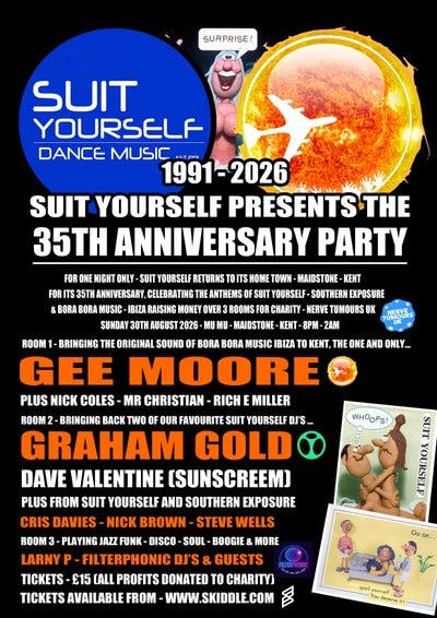 Suit Yourself Music (1991 - 2026) celebrates 35 years in the business by returning to Maidstone Kent where it was born for a very special one off event to raise money for Nerve Tumours UK.