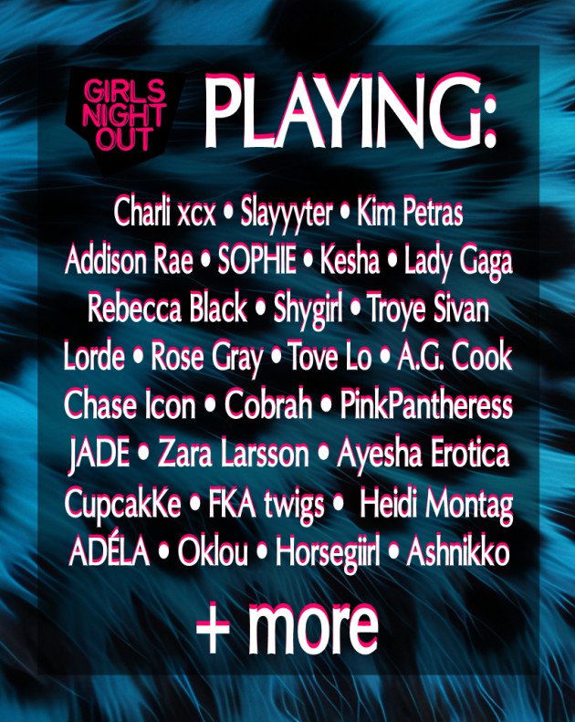 Charli xcx • Slayyyter • Kim Petras • Addison Rae • SOPHIE • Kesha • Lady Gaga • Rebecca Black • Shygirl • Troye Sivan • Lorde • Rose Gray • Tove Lo • A.G. Cook • Chase Icon • Cobrah • PinkPantheress • JADE • Zara Larsson • Ayesha Erotica • CupcakKe • FKA twigs • Heidi Montag • ADÉLA • Oklou • Horsegiirl • Caroline Polachek • Six Sex • Grimes • Ashnikko • Lana Del Rey + more