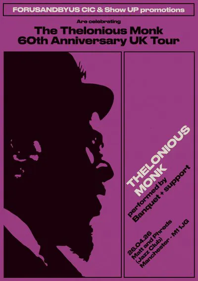 The Thelonious Monk 60th Anniversary Project Tour celebrates the 60 years since Thelonious Monk's landmark 1966 UK tour. The project will recreate Monk's original setlists and performing in the towns and cities when he first arrived in the UK. As part of this project, we aim to perform in the same cities-and where possible, the same venues-visited during Monk's original tour. The band that will be performing on the night go by the name Banquet - that is a talented jazz fusion band in their own right but have taken great pleasure in joining the project in celebrating this momentous occasion.