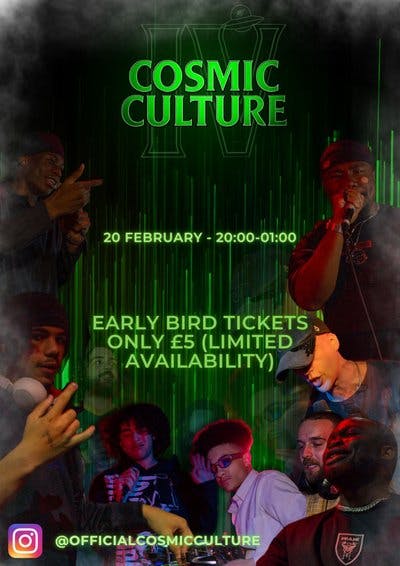 Get ready an unforgettable night at Cosmic Culture, a live music showcase featuring the city's rising stars. Expect raw talent, DJ sets, and high-energy performances all night long. Whether you're familiar with our artists or just looking for a great night out, this is the event you don't want to miss!