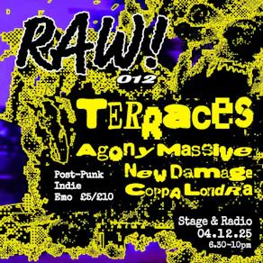 RAW!’s final gig of the year brings Terraces back to the basement on Dec 4th after a lengthy hiatus. They’ll be playing mostly new material blending Shoegaze, Emo, Post-Punk and Hardcore.