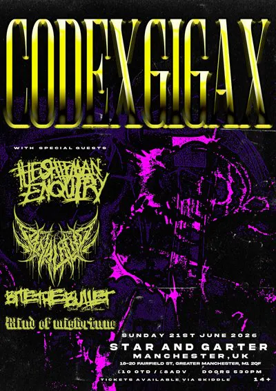 Worldwide Revival Deathcore Champions in Codex Gigax headlining to bring you a special and exclusive set for their first shows as a band playing their debut EP "Cycles Of The Serpent" in full as well as it being their only event appearances of 2026. FFO: Rev3rent, Psycho Frame, Heavy//Hitter.