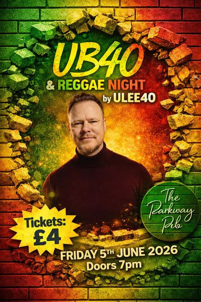 Get ready for an unforgettable UB40 & Reggae Night by ULEE40 🎤🌴 at The Parkway Pub 🍻 on Friday 5th June 2026 📅 (Doors open 7pm ⏰).