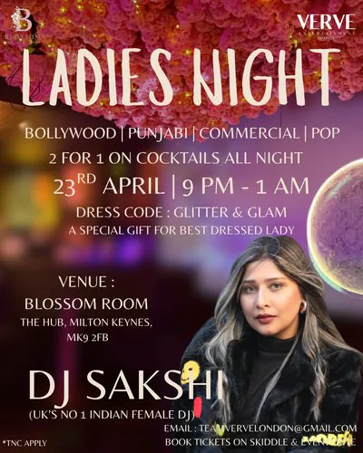 VERVE Entertainment presents Milton Keynes biggest Ladies Night ft DJ SAKSHI ( UK's No 1 Indian Female DJ ) on April 23rd, 09.00 PM onwards.