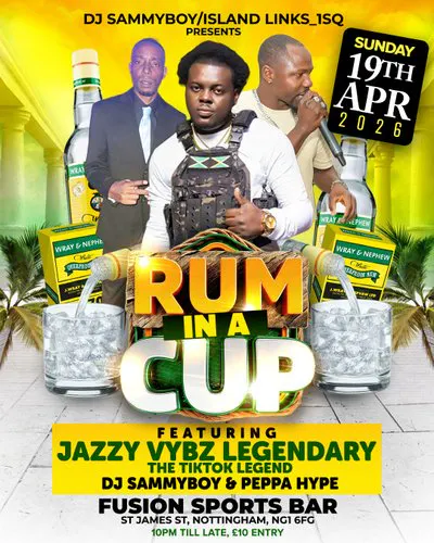 DJ SammyBoy/ Island Links_1SQ entertainment presents Rum In A Cup featuring Jazzy Vybz Legendary, The TikTok Legend first time in Nottingham along side Peppa Hype. Good Vibes and Music all night.