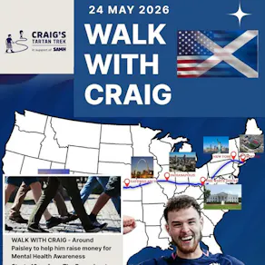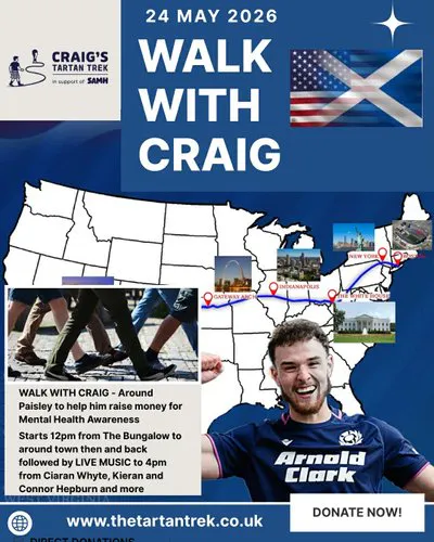 Join us for a special community event as we support Craig Ferguson of Paisley on his incredible journey walking 3,200 miles across America from LA to Boston for Scotland’s World Cup match to raise awareness and funds for men's mental health.