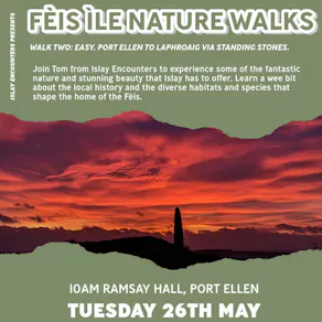 Starting at Ramsay Hall Car Park, we will join the three distilleries path for a relaxed walking loop taking in some local history, including ancient standing stones and old abandoned settlements. There are great opportunities for some wildlife watching along the way, we will also visit the Laphroaig dam before heading towards the distillery. You can finish the tour at Laphroaig or continue back with me to Port Ellen on the three distilleries path via McDougall's monument.