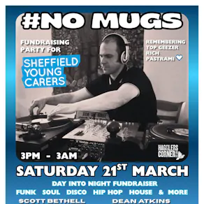 #NO MUGS: Day to night fundraising party. Remembering inspirational top geezer Richard Haslett aka Rich Pastrami. Celebrating his life and love of music while raising funds and awareness for Sheffield Young Carers, the charity that was so close to Rich's heart. We've brought together a fantastic selection of DJ's spinning Funk, Soul, Disco, Hip Hop, House and more. Taking over the courtyard from 3pm and moving into the Bar and Attikk from 9pm. Plus a new chilled out cocktail bar in Birkana Cafe.