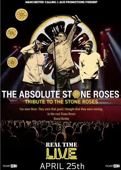 The Absolute Stone Roses are a Tribute Band to the Manchester legends The Stone Roses. Their aim is to recreate that iconic sound and vibe that you get at a Stone Roses concert and bring it to live audiences all over the UK and Europe. The band themselves are massive fans with an obvious great love for The Stone Roses and have worked hard to recreate the sound. The Absolute Stone Roses have performed several times alongside Clint Boon (Inspiral Carpets) and the Manchester legend Bez ( The Happy Mondays) both Manchester Legends in their own right. They have also played shows with some of the cast from Shane Meadows channel 4 drama (This is England) with Thomas Turgoose aka Shaun and Andrew Shim aka Milky. They have shared the stage with other Britpop Legends such as The Lightning Seeds, Nigel Clarke (Dodgy) and Tommy Scott from the band (Space) The Absolute Stone Roses have performed on stages with audience capacities spanning from 300 to 7000 people. They have performed and headlined at many of the major tribute festivals in and around the UK and continue to do so. The Absolute Stone Roses play an awesome set of all the best roses material. Expect to hear all the classics Waterfall, Made of Stone, Resurrection, I Wanna Be Adored, Fools Gold, Love Spreads and many more. If you've never seen the real deal or want to re-live your youth or want to feel that vibe then The Absolute Stone Roses will take you on a trip with the attitude and baggy fashion.