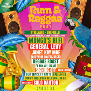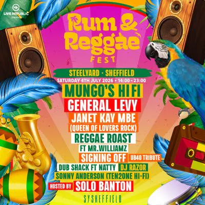 We've lined up some of the biggest names in UK reggae, dub, and sound system culture to keep you dancing all day long. Experience the heavyweight energy of Mungo's Hi Fi with Solo Banton, bringing their signature sound of deep bass and pure vibes. Feel the fire from General Levy, the man behind the iconic "Incredible," and don't miss Reggae Roast ft. Mr Williamz, delivering roots, dub, and carnival spirit in full force. We're also proud to welcome the Queen of Lovers Rock, Janet Kay MBE, performing her timeless anthems and smooth soulful sounds, a special guest will also be joining the party, announcement coming soon! Plus, Signing Off (UB40 Tribute) will bring the classics you know and love, while Ten2one, Dub Shack ft Natty and DJ Razor hold it down for Sheffield's reggae scene, showcasing true sound system power. Hosting the day, the ever-charismatic Solo Banton will keep the crowd moving and the energy sky-high! 🎶💛